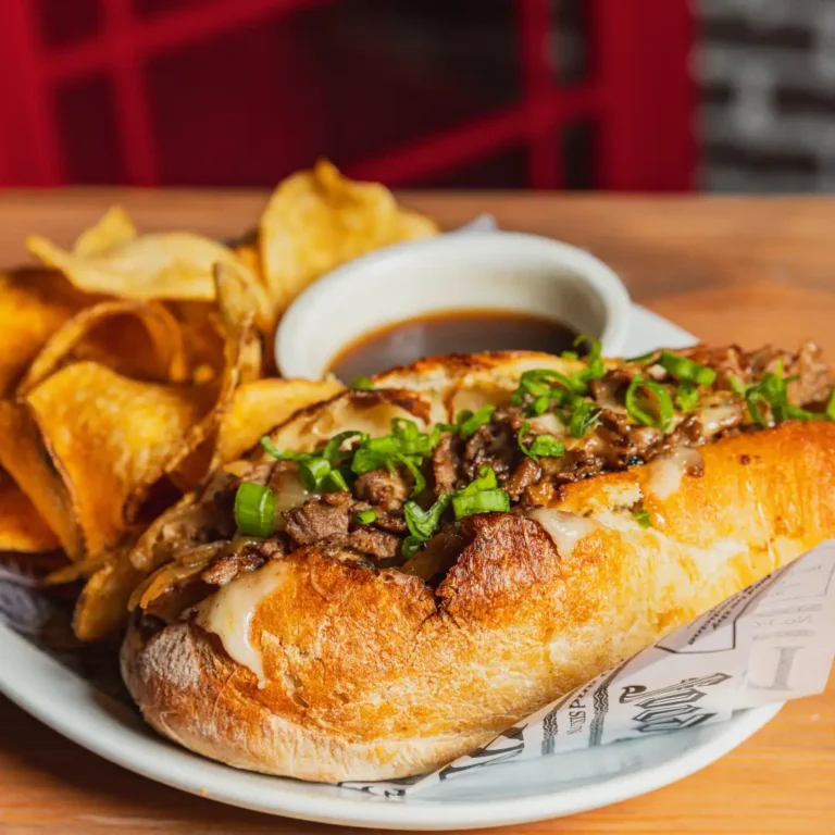 Sliced ribeye, caramelized onions, Swiss and Provolone cheeses and a horseradish garlic aioli, on a toasted baguette and au jus for dipping