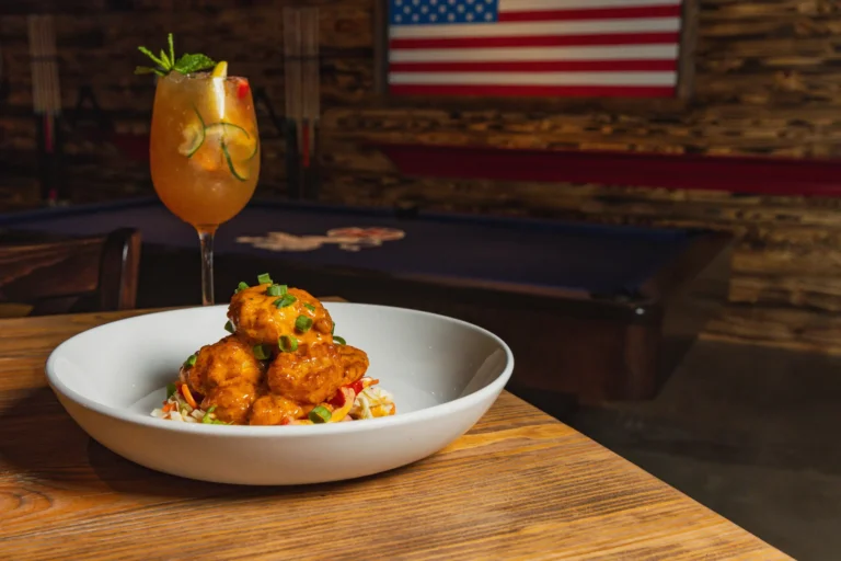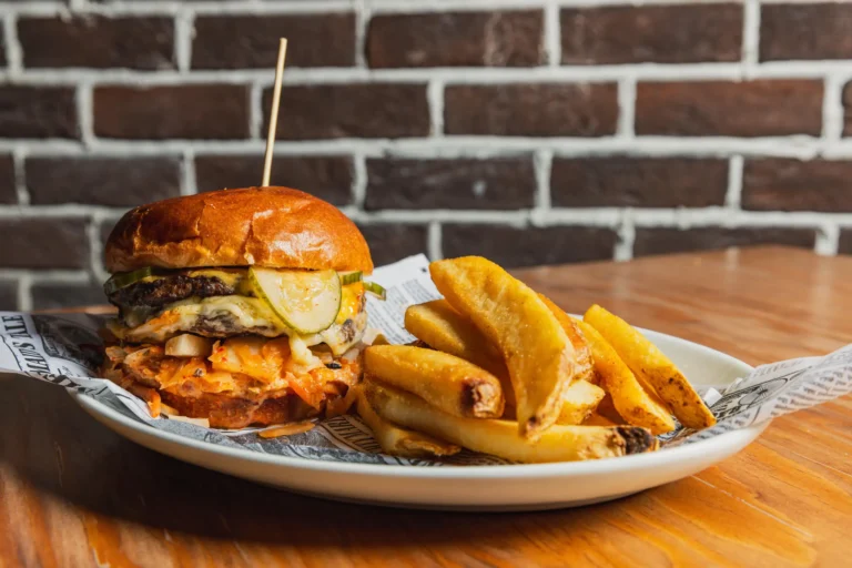 Two 4 oz patties, sriracha ketchup, fried egg, crispy onion straws, candied bacon, caramelized onions, American cheese and smashed crispy fries, finished with our Yeoman’s house sauce